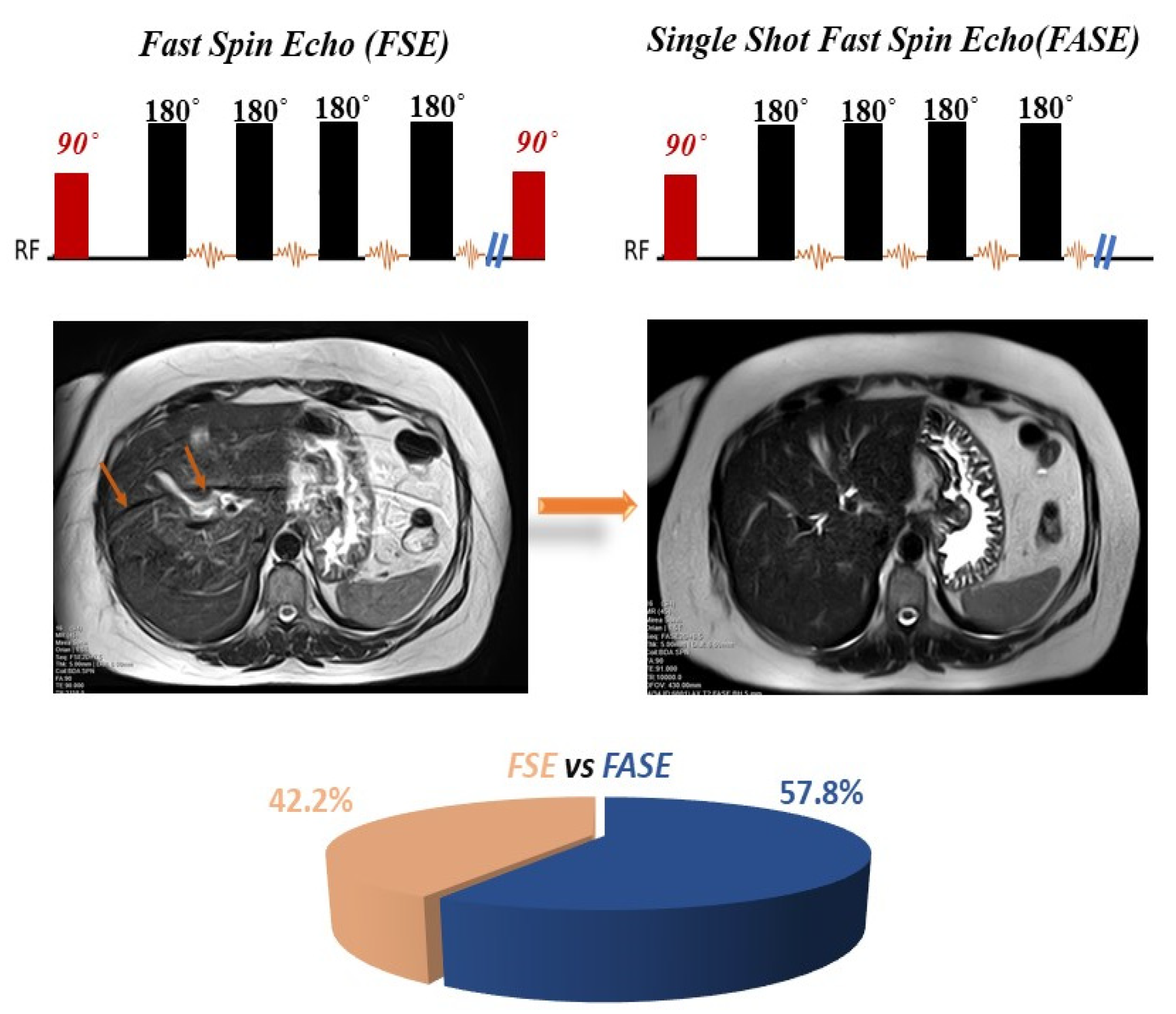 - Single-Shot Fast Spin Echo (Canon: FASE) is a spin echo sequence, which uses the single-shot technique to acquire the data after a single 90˚ radio frequency (RF) excitation pulse, followed by a series of 180˚ RF pulses. All the data (e.g., 256) are acquired in a single TR (Scheme 3—right); therefore, all the lines from the k space are completed at the same time. In the case of Fast Spin Echo (FSE), a multi-shot technique, the number of shots depends on the value of echo train length (if echo train length (ETL) = 16 and Phase Encode Matrix Size = 256, then the number of shots is equals to 256 divided by 16) (Scheme 3—left). Using FASE, sequences with a shorter duration are obtained, which, in the case of the abominable MRI, leads to the reduction or even elimination of movement artifacts (Scheme 3). A total of 45 abdominal examinations were evaluated to assess the feasibility of performing FASE versus FSE sequences. These data were used to provide a statistical overview of sequence applicability. Detailed morphological analysis is illustrated through representative cases, rather than for all patients individually. Out of the 45 patients from the Smeeni Chronic Disease Hospital, only 19 (42.2%) were able to adequately hold their breath during the FSE sequence. For the 26 patients (57.8%), the faster FASE sequence was required, as it allowed for a shorter acquisition time, reducing the challenges associated with breath-holding (Scheme 3).