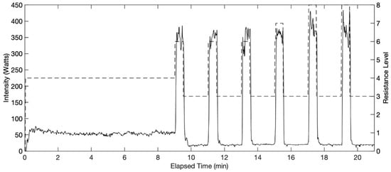 Twenty-one-minute IT included a nine-minute warmup at 30–75 W, six 30-s sprint intervals, and six 90-s rest intervals at 10–30 W between each sprint and after the last sprint. The dashed line indicates the resistance levels set for the intervals in this example IT profile. The resistance levels provided by the exercise machine are on an ordinal scale where higher numbers indicate greater resistance.