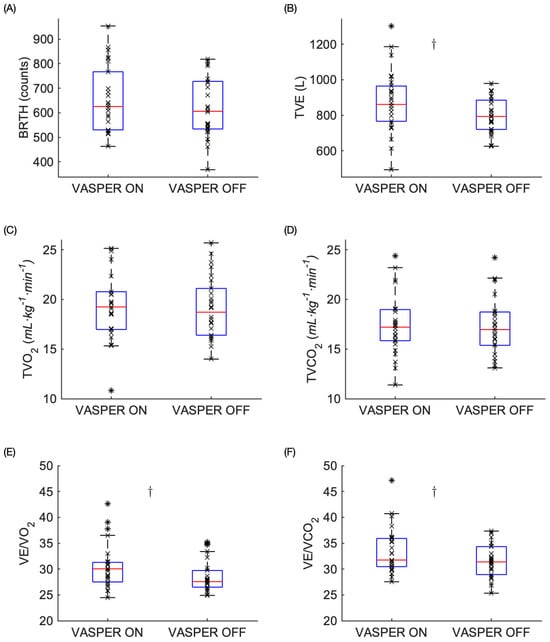 Metabolic and respiratory measures Post-EX including BRTH (A), TVE (B), TVO2 (C), TVCO2 (D), VE/O2 (E), and VE/CO2 (F). The box represents the interquartile range with the median bar within the box. The whiskers extend to the most extreme data points. The outliers are indicated by the * symbols. The dagger (†) indicates statistically significant differences between two conditions after comparing the p values to the adjusted α level using the Benjamini–Hochberg test.