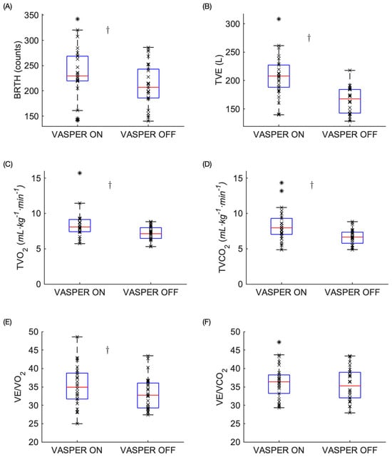 Metabolic and respiratory measures during the EX including BRTH (A), TVE (B), TVO2 (C), TVCO2 (D), VE/O2 (E), and VE/CO2 (F). The box represents the interquartile range with the median bar within the box. The whiskers extend to the most extreme data points. The outliers are indicated by the * symbols. The dagger (†) indicates statistically significant differences between two conditions after comparing the p values to the adjusted α level using the Benjamini–Hochberg test.