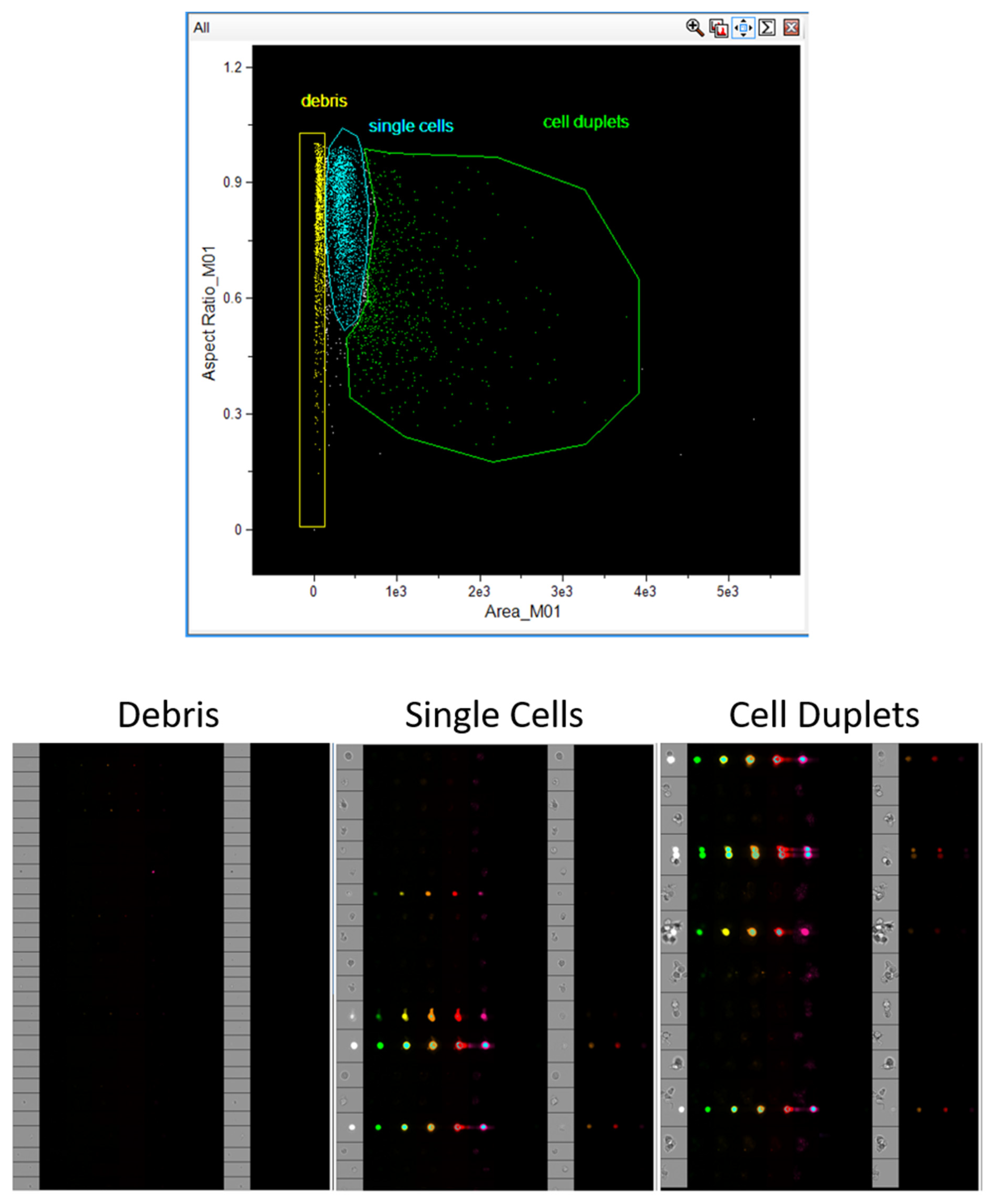 - Gating of single cells. Despite resuspension and a stable laminar flow, some events may represent two or more cells clumped together, which would be recorded as a single event with inaccurate fluorescence and morphology measurements.