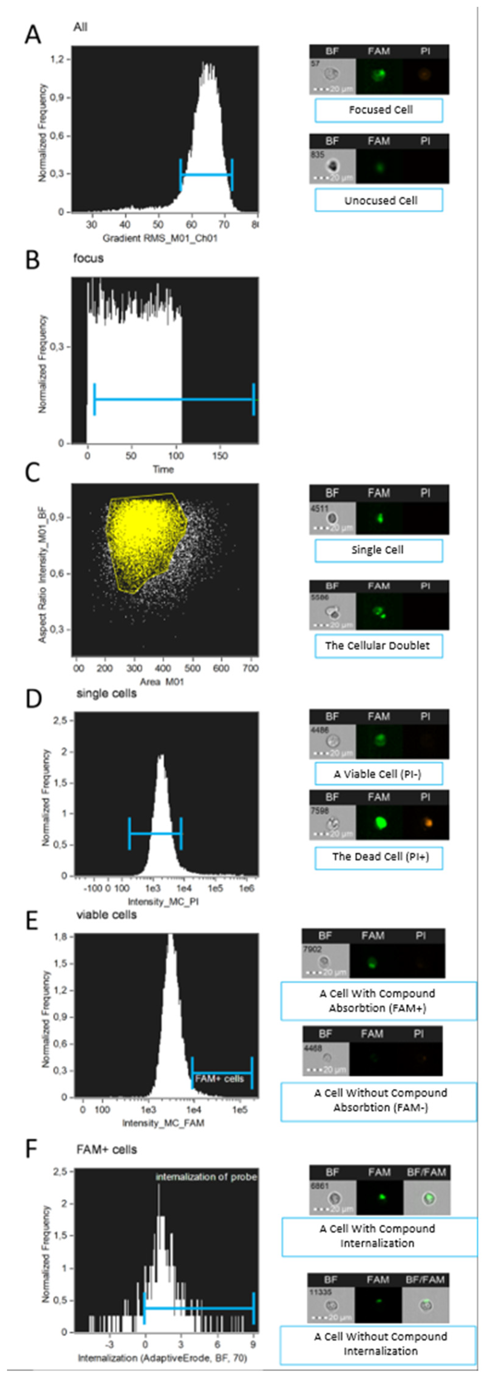 - Gating of in-focus cells. Cells that are not in focus cannot be accurately analyzed for fluorescence intensity.