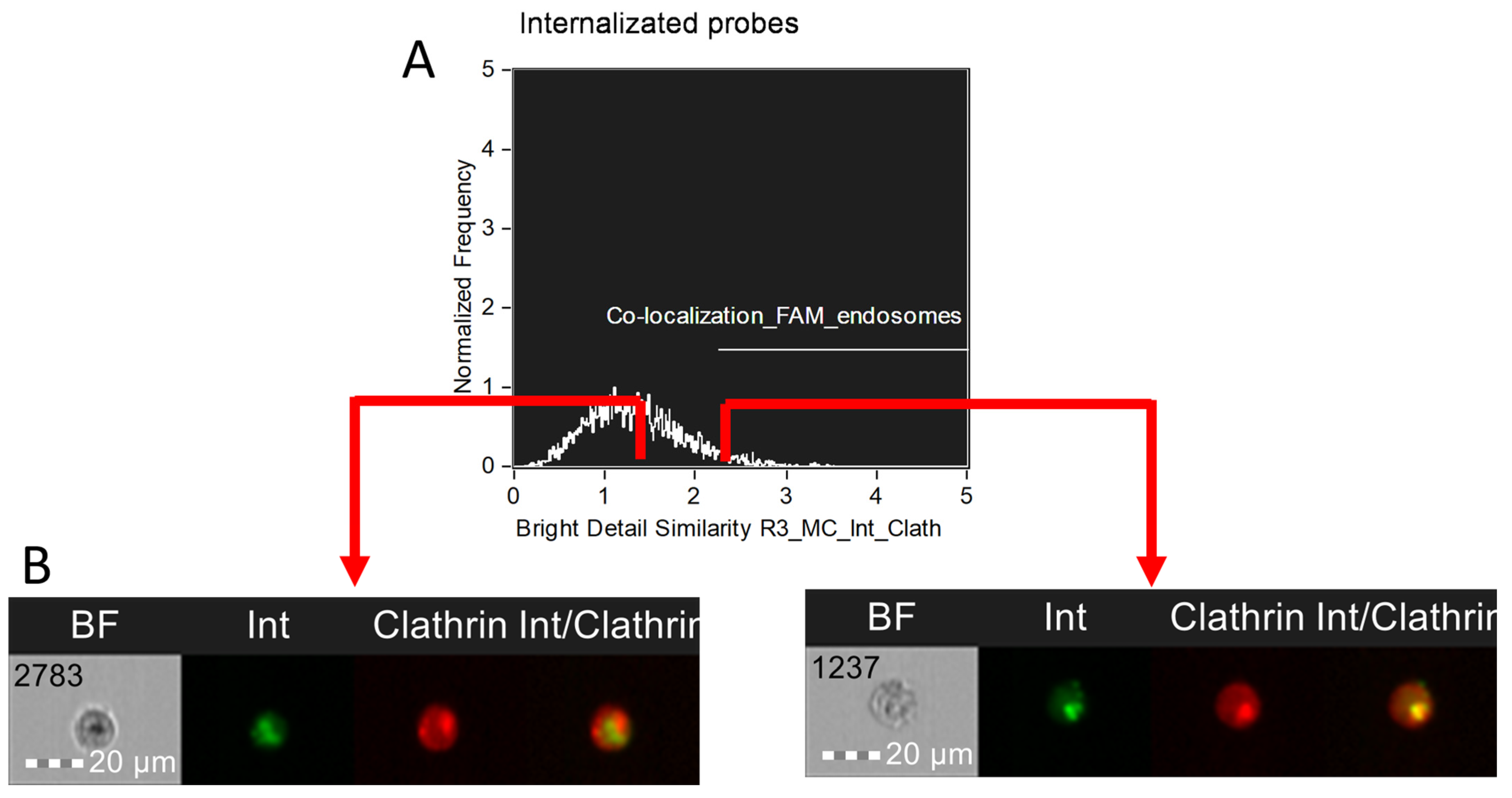 - Optional: Add 400 mL of fixation buffer (BioLegend, San Diego, CA, USA; Cat. No. 420801) to the cells. Incubate the cells at room temperature for 10 min. Centrifuge at 300 RCF for 5 min. Aspirate the supernatant. Resuspend the cells in 500 µL of 1× Intracellular Staining Permeabilization Wash Buffer (BioLegend, San Diego, CA, USA; Cat. No. 421002). Incubate the cells at room temperature for 10 min. Centrifuge at 300 RCF for 5 min. Aspirate the supernatant. Resuspend the cells in 500 µL of Cell Staining Buffer (BioLegend, San Diego, CA, USA; Cat. No. 421002). Centrifuge at 300 RCF for 5 min. Aspirate the supernatant. Resuspend the cells in 100 µL of Cell Staining Buffer (BioLegend, San Diego, CA, USA; Cat. No. 421002). Add 1 µL of antibodies to clathrin heavy chain (Thermo Fisher Scientific, Waltham, MA, USA; Cat. No. MA1-065-A647) at a concentration of 10 µg/mL. Incubate the cells at room temperature in the dark for 1 h. Centrifuge at 300 RCF for 5 min. Aspirate the supernatant. Resuspend the cells in 100 µL of Cell Staining Buffer (BioLegend, San Diego, CA, USA; Cat. No. 421002).