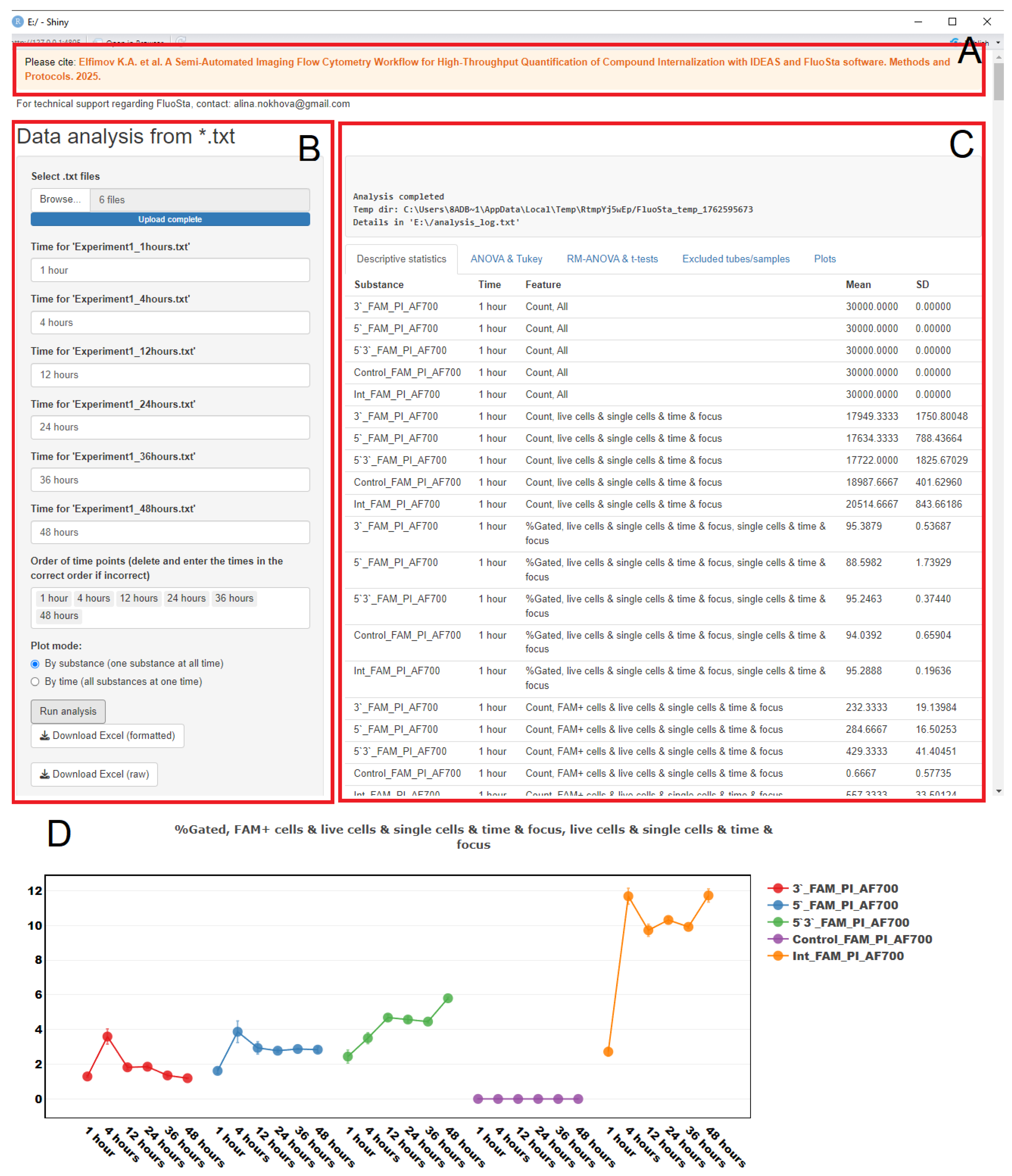 - The open window of FluoSta displays descriptive statistics, a comparative analysis, and interactive graphs for data visualization. You can use the statistical analysis results to compare parameters of a single compound over time (the RM-ANOVA and t-tests tab), as well as to compare different compounds at a single chronological time point (the ANOVA and Tukey tab). In the output, you can download a file in .xlsx format with your statistical analysis. Two display modes are available for the graphs. If needed, graphs can be downloaded in PNG format by clicking the camera icon.
