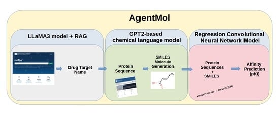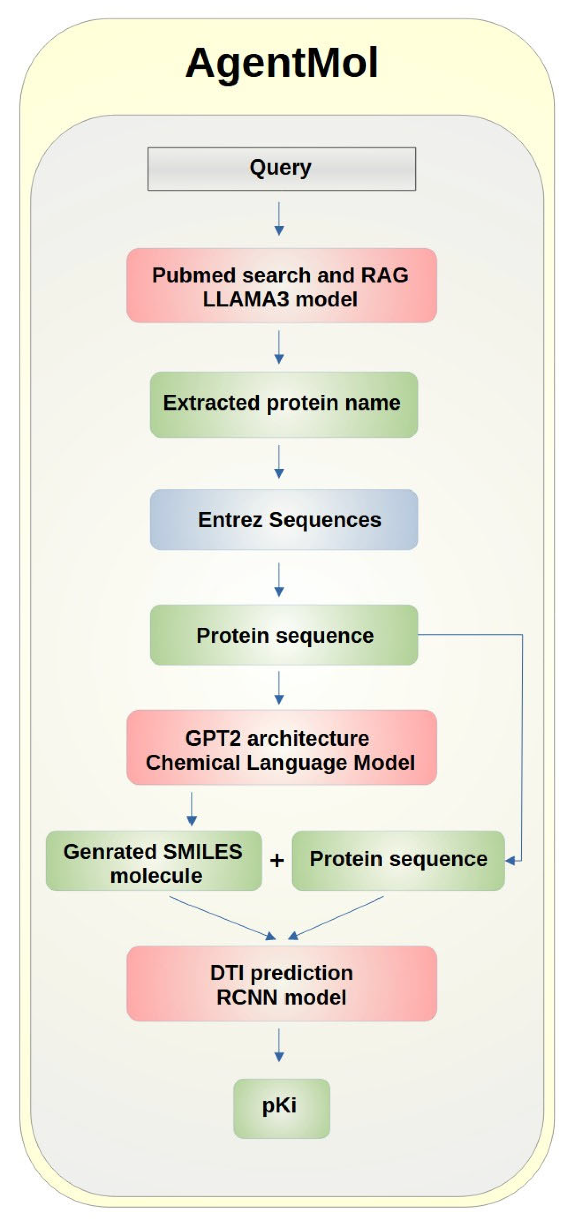 The conceptual novelty of AgentMol lies in the direct integration of retrieval-augmented generation (RAG), sequence-based molecular generation, and affinity prediction within a single, modular framework. In contrast to prior generative AI systems that address molecule design and target prediction as independent stages, AgentMol establishes a unified workflow that begins with automatic identification of potential protein targets directly from biomedical abstracts using the RAG module. This retrieved contextual information guides the subsequent GPT-2–based molecular generation conditioned on protein sequences, effectively linking target discovery with compound design. The generated molecules are then evaluated by the RCNN model for their predicted binding affinity, forming an end-to-end, knowledge-driven system that seamlessly connects information retrieval, molecular generation, and predictive evaluation within a single automated pipeline.