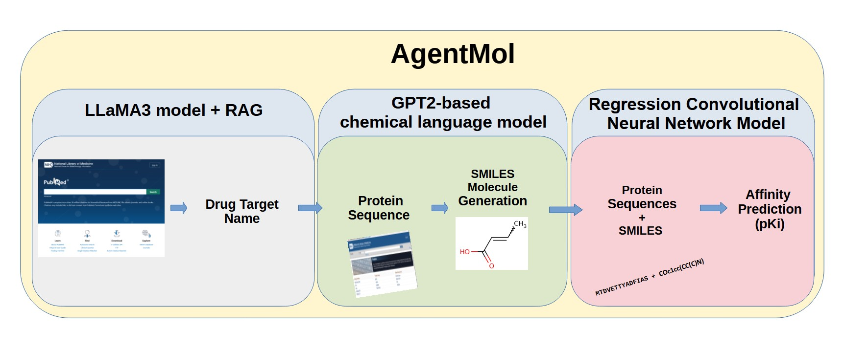 A generative chemical model, architecturally based on GPT-2, is then employed to translate the protein sequence into a candidate small molecule represented in SMILES format. To assess the interaction potential between the generated molecule and the target protein, a regression convolutional neural network (RCNN) model is utilized. This model integrates both the SMILES representation and the protein sequence to predict the pKi value, a quantitative measure of binding affinity. All components of AgentMol are orchestrated using the LangGraph framework [