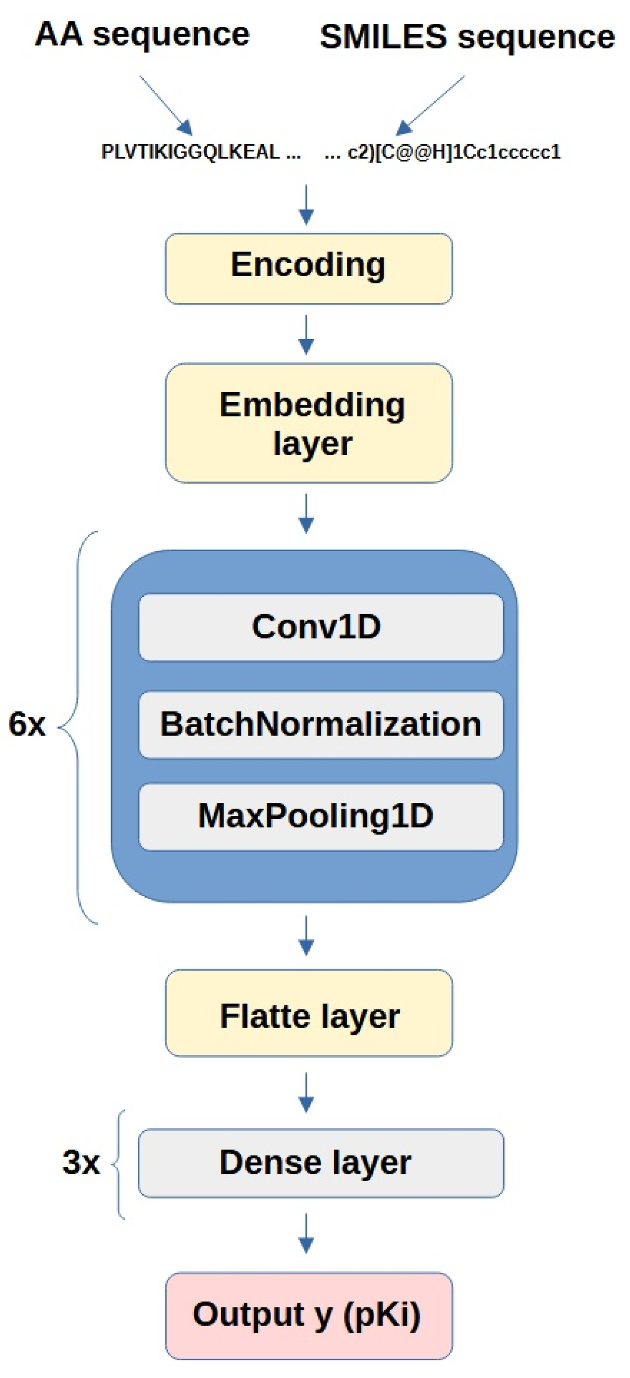 The input sequences, consisting of concatenated amino acid and SMILES strings, were to kenized at the character level using the Keras Tokenizer and padded or truncated to 800 tokens. The embedding layer converted integer-encoded tokens into 8-dimensional dense vectors. The model architecture comprised six one-dimensional convolutional layers with kernel sizes of 8, filter numbers from 32 to 64, and batch normalization, each followed by max-pooling (size = 2). Leaky ReLU activation (α = 0.01) was applied to all convolutional layers. The extracted features were flattened and passed through two fully connected layers (512 and 10 neurons) and a final linear output predicting continuous pKi values.