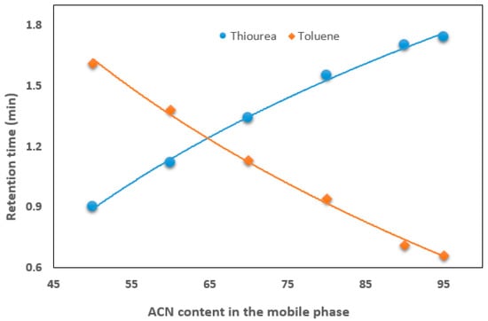 The hydrophilicity and non-polar properties of the monolith surface were investigated by examining the retention of two test solutes (thiourea and toluene) in a mobile phase containing a wide range of ACN. Figure 2 shows that the retention time of thiourea increases with increasing ACN content in the mobile phase, while the retention of toluene decreases. In terms of hydrophilic interactions, thiourea exhibits good retention at a high ACN content (e.g., 90%) in the mobile phase, indicating a strong hydrophilic interaction with the monolith surface.