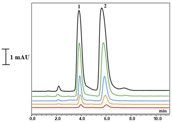 Separation chromatograms of L-CAR and Acetyl-L-CAR with different concentration. Chromatographic conditions: mobile phase: ACN/Water with phosphate-buffered solution (92:8, v/v) with 0.1% TFA. Flow rate: 400 nL/min. 220 nm: Peaks: (1) L-CAR, (2) Acetyl-L-CAR.