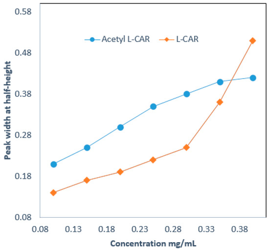 Sample loading was performed by injecting various concentrations of L-CAR and Acetyl-L-CAR, ranging from 0.01 to 5 mg/mL. The sample volume injected was 20 nL. The loading capacity of the developed hydrophilic column was calculated according to the corresponding peak width at half-height (W1/2) [20]. An increase of 10% was observed in the peak width at a small sample volume. Figure 5 shows the loading capacity test results for a 13 cm hydrophilic monolith. As can be seen, the W1/2 for L-CAR at 0.1 µg/mL increased by 17% over the peak width, while the W1/2 for Acetyl-L-CAR at 0.3 µg/mL increased by 13% over the peak width. The loading capacities for L-CAR and Acetyl-L-CAR were 0.55 mg/mL and 0.84 mg/mL, respectively. This indicates that the hydrophilic monolith under investigation has a relatively high loading capacity for both L-CAR and Acetyl-L-CAR.