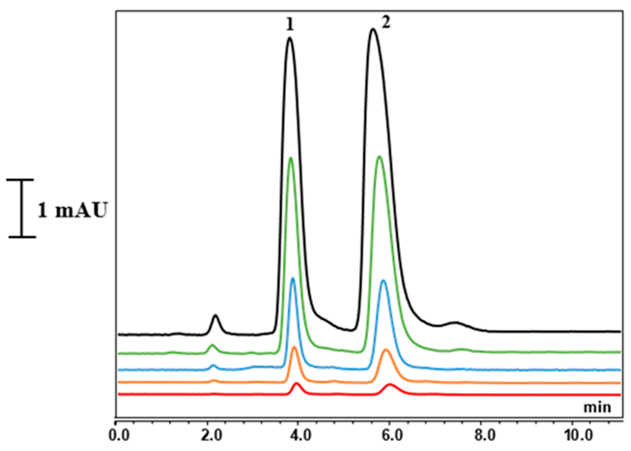 3.2. Optimization of Chromatographic Conditions in Nano LC-UV