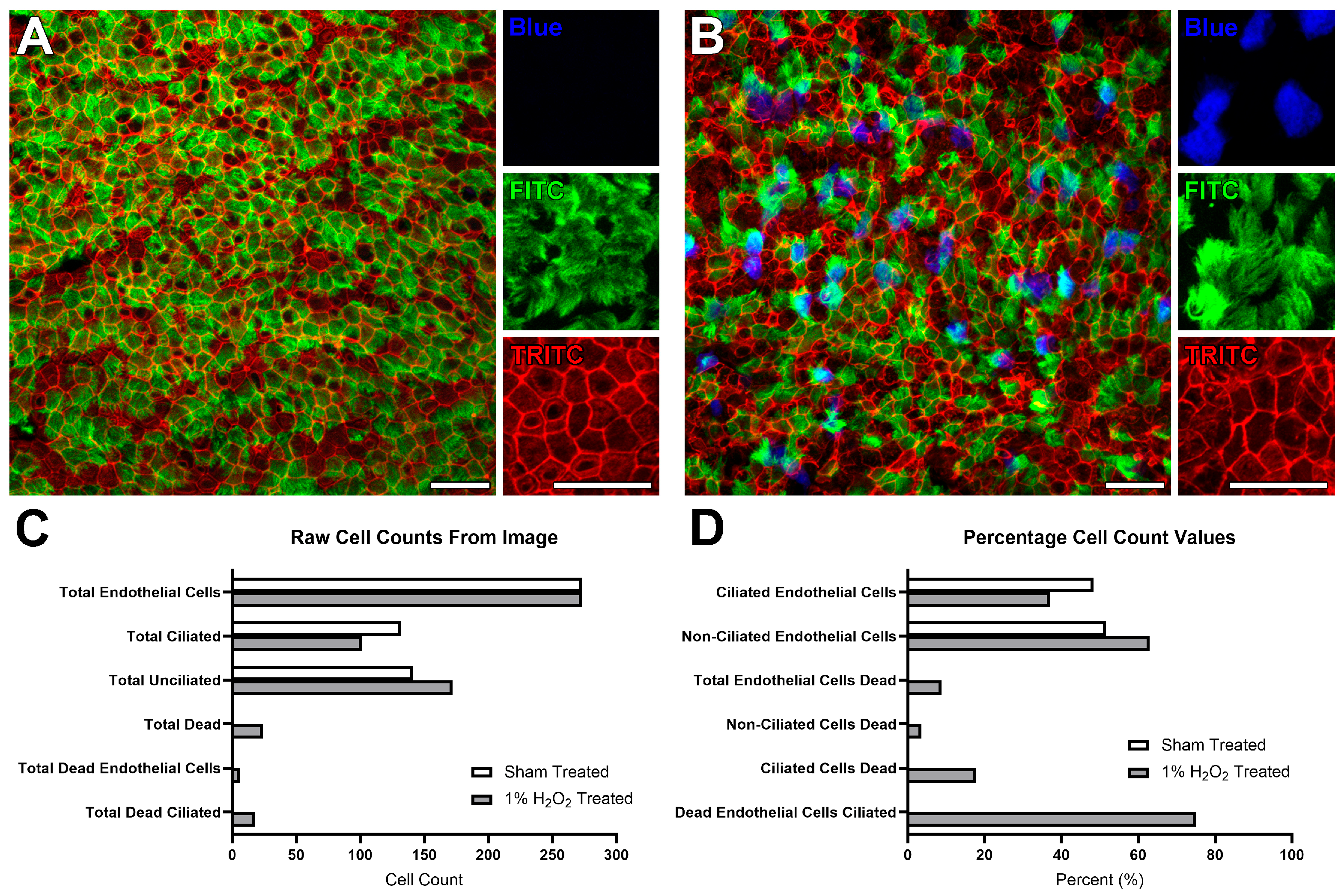 - Total nonciliated epithelial cells stained dead (using the green and blue channels).