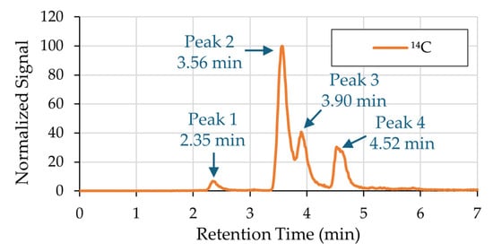 Figure 3 supports the identifications of Peaks 1–3 by demonstrating close co-elution of the 14C peaks with their assigned ions. Overlays of the EICs on the 14C chromatogram show highly similar peak shapes. Minor discrepancies—broader 14C features, tailing peaks and small RT shifts—are expected and attributable to band broadening introduced during combustion on the moving wire interface and to longitudinal diffusion as CO2 is transferred via capillaries to the AMS source. These observations are consistent with true co-elution and support the proposed identities for Peaks 1–3.