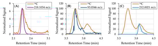 14C chromatogram overlaid with EICs obtained by the orbitrap mass analyzer. (A) Peak 1 aligned with the EIC of 218.1034 m/z; (B) Peak 2 aligned with the EIC of 93.0346 m/z; and (C) Peak 3 aligned with the EIC of 212.0021 m/z. Band broadening of the 14C peaks are a result of the combustion process of the moving wire interface and longitudinal diffusion in the capillaries that transfer the gaseous sample from the interface to the AMS source.