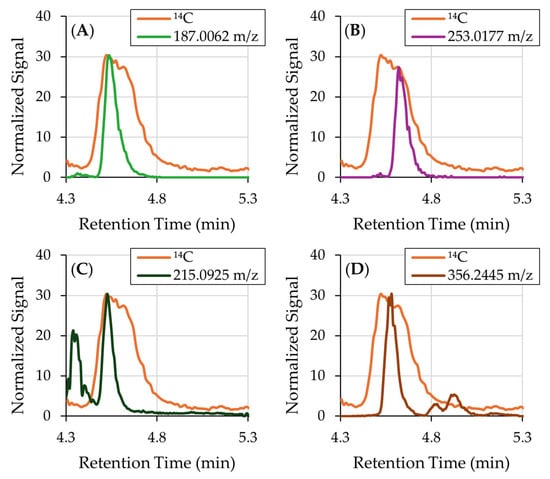 (A) 14C chromatogram overlaid with EICs obtained by the orbitrap mass analyzer demonstrating ions that coelute with Peak 4. (A) 187.0062 m/z and (B) 253.0177 m/z are not broad enough to match the peak shape. (C) 215.0925 m/z and (D) 356.2445 m/z both are not broad enough and have extraneous unlabeled peaks.