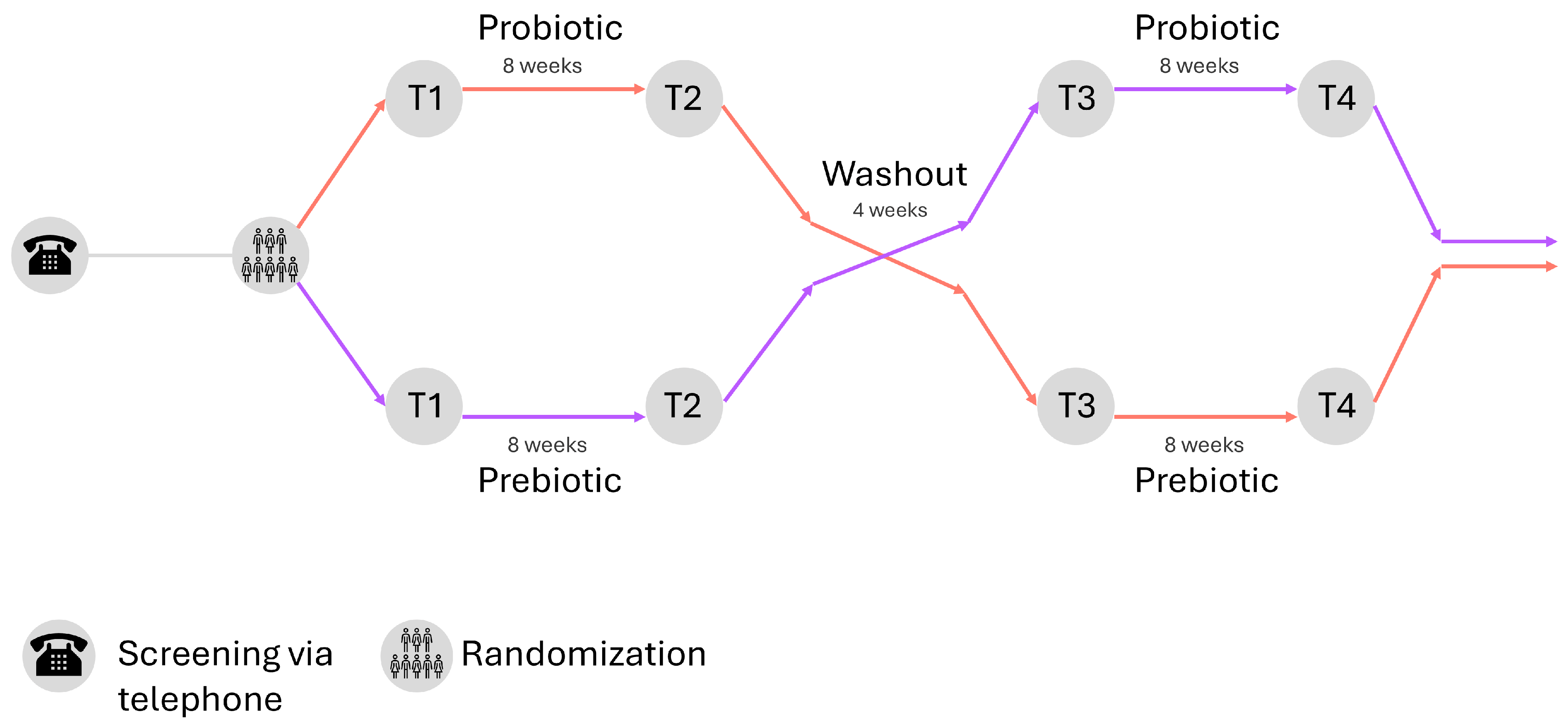 The first intervention phase is followed by a 4-week washout period to prevent carryover effects. Previous studies in non-disabled individuals have proven 1–2 weeks to be sufficient for effects of inulin-type fructans (prebiotics) to disappear after the intake has ceased [