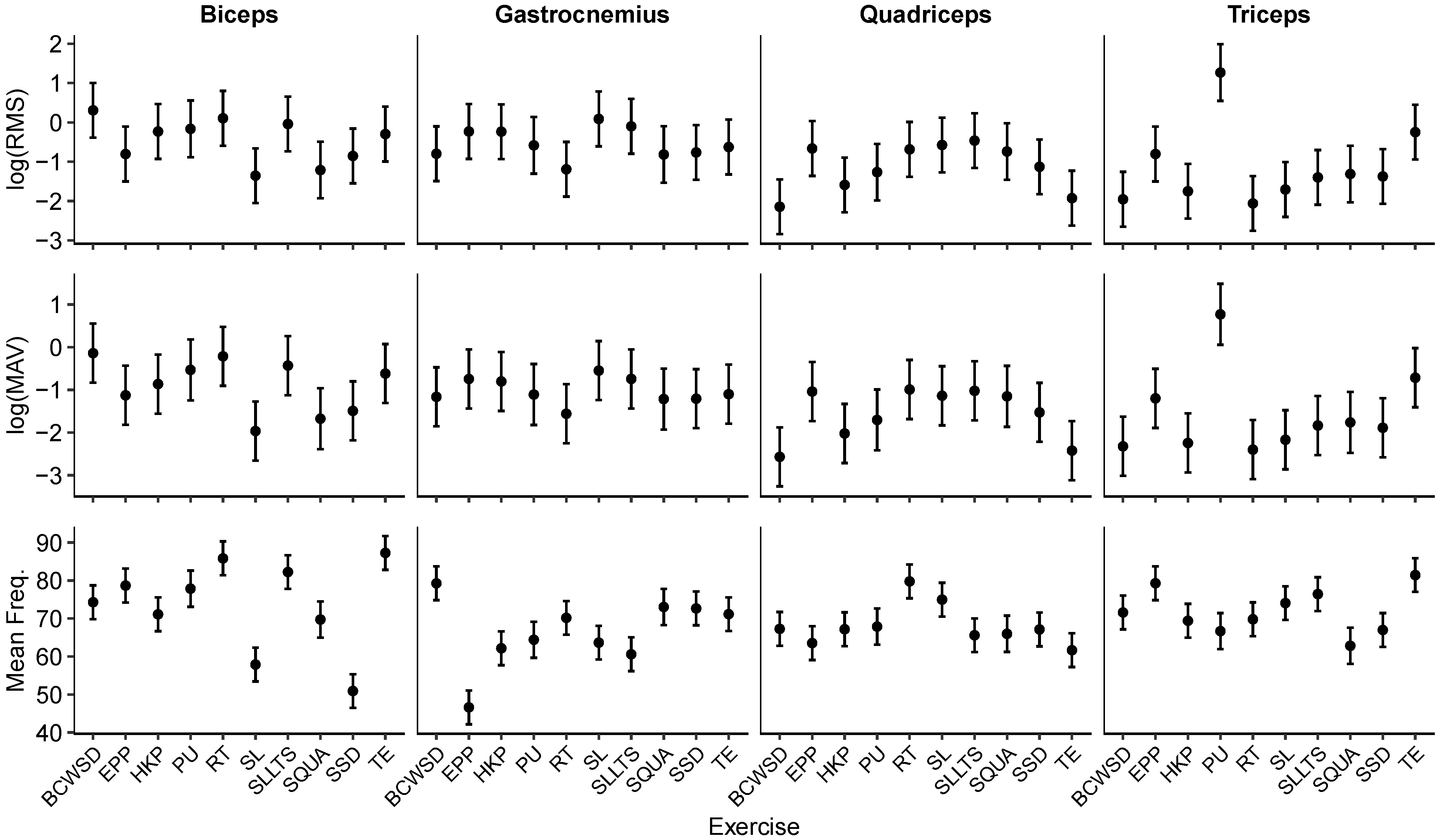 Figure 5). RMS and MAV responses were consistently lower during squat (SQUA) and single lunge (SL) compared to baseline conditions, particularly in the quadriceps and triceps, whereas push-up (PU) and elbow plank + pointe (EPP) elicited significantly higher triceps responses. For frequency-domain measures, mean frequency showed pronounced reductions during single lunge (SL) and slower speed deadlift (SSD), but elevations for exercises emphasizing upper-limb loading, such as triceps extension (TE). These muscle- and task-specific divergences reinforce the necessity of interpreting amplitude- and frequency-domain indices in tandem.