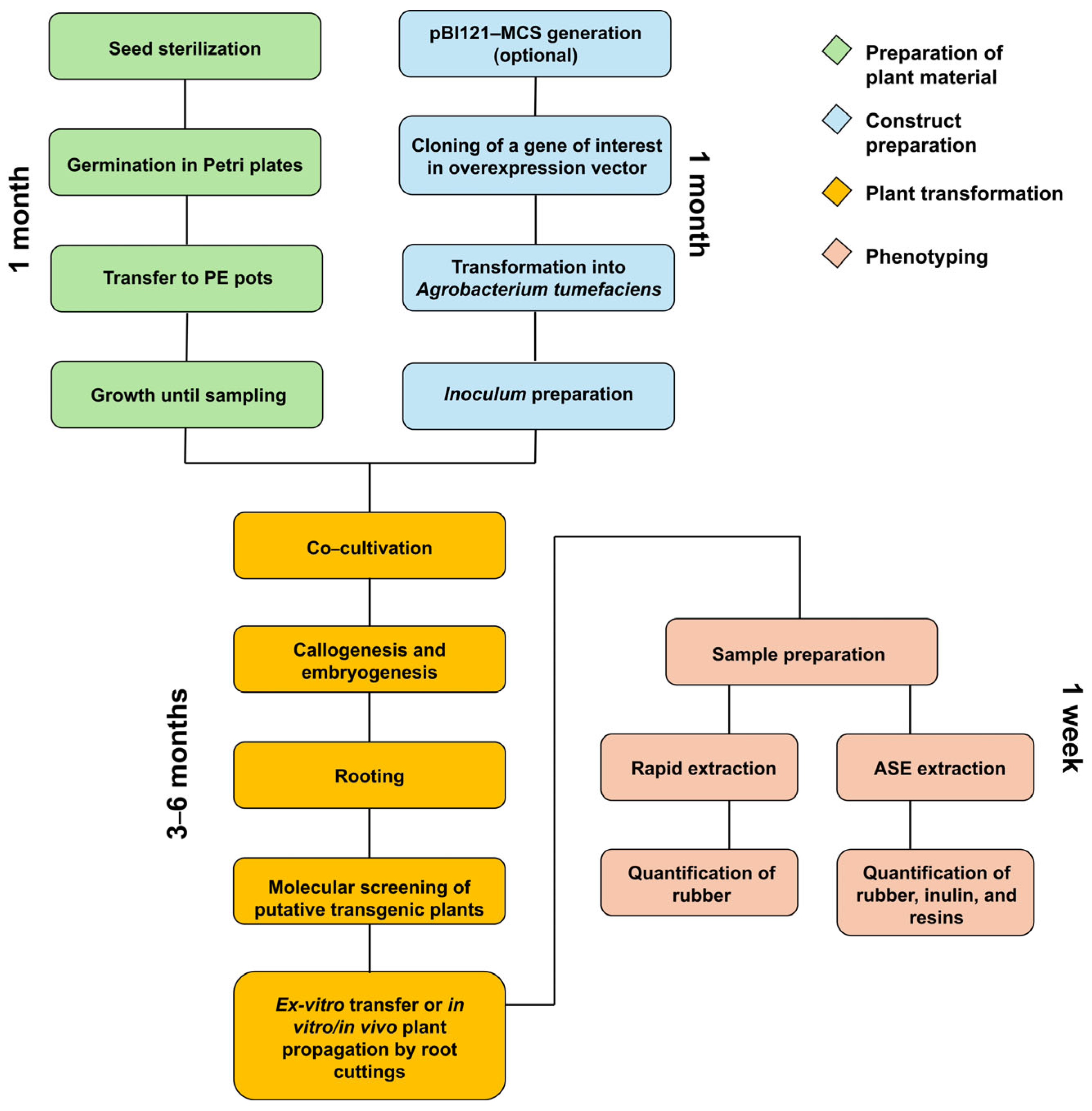 In this study, we present a simple and optimised transformation protocol suitable for Tks. All the necessary steps—from the realization of the construct to the detailed description of the transformation and regeneration procedures, including explant type, bacterial strain, co-cultivation conditions, and selection regimes—are described. The protocol has been optimised for effectiveness across a range of genotypes including Taraxacum brevicorniculatum, a close Tks relative species [14], and is compatible with downstream molecular and phenotypic analyses. We included a step-by-step description of the protocol for the evaluation of rubber, inulin, and resin content. This work provides essential tools for the study of this emerging rubber crop and can be further adapted to applications such as genome editing, gene functional validation, and precision breeding.