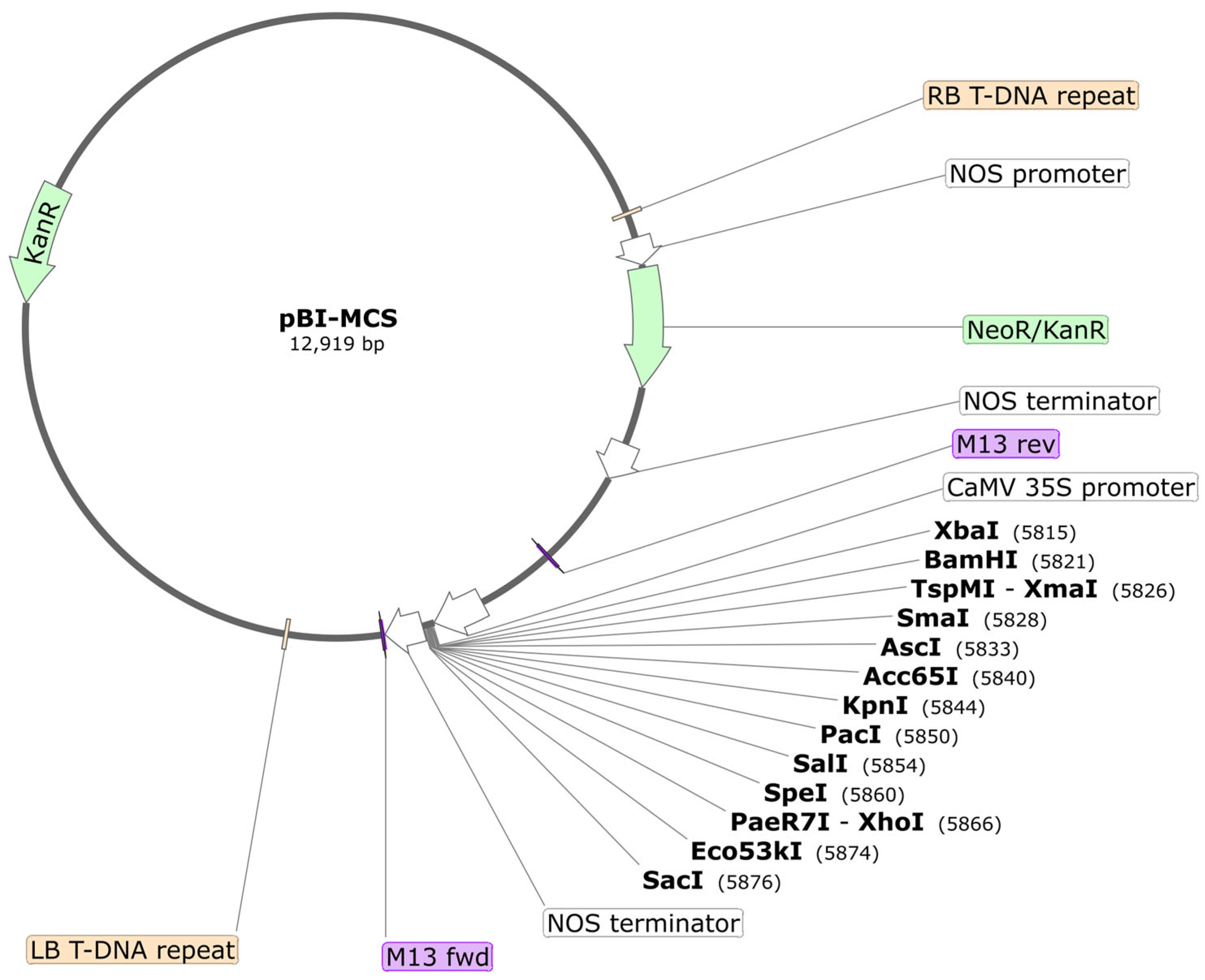 Removing GUS allows direct insertion of any gene of interest in its place, enabling the production of recombinant constructs without interference from this reporter gene. This modification increases the flexibility of the vector for functional studies, overexpression experiments, and other molecular applications where the presence of GUS is unnecessary or would complicate downstream analyses. The introduction of additional restriction sites facilitates the cloning of a gene of interest (GOI). The T-DNA region of the plasmid contains the nptII gene, which provides resistance to kanamycin, and is under the control of the constitutive nos promoter.