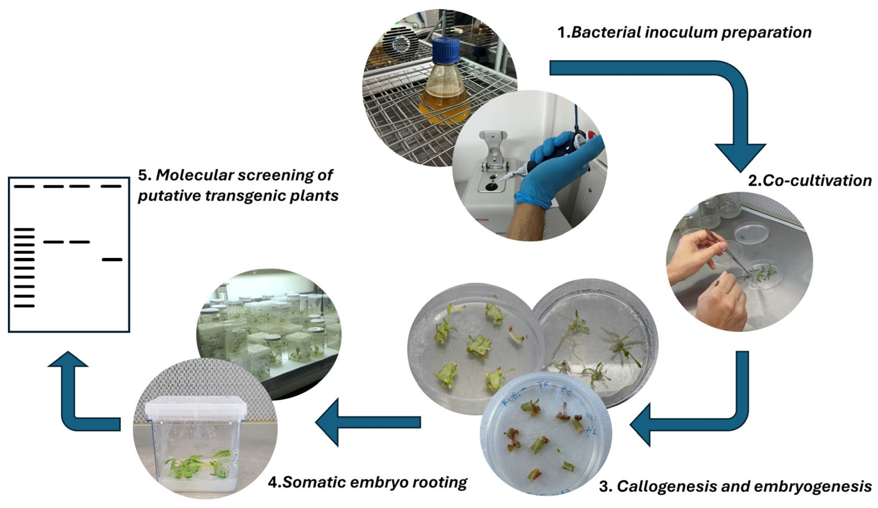 Figure 3. Graphical representation of the main steps of plant transformation starting from Tks leaf explants using Agrobacterium tumefaciens strain EHA105.