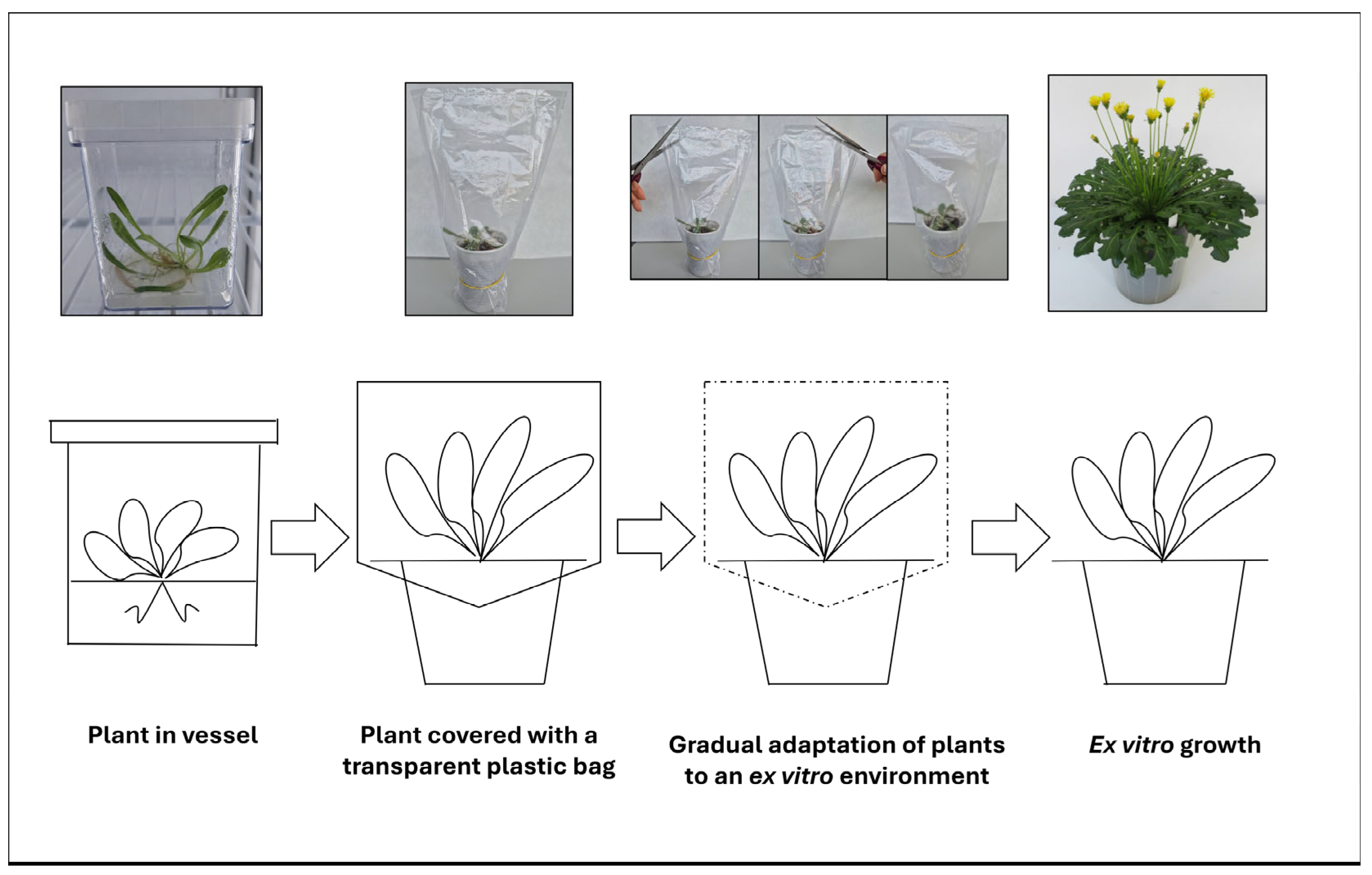 Figure 4. Procedure for the transfer of ex vitro plants. Progressive acclimatisation of in vitro Tks plant is achieved by covering with a plastic bag after transplantation and subsequent gradual bag opening.