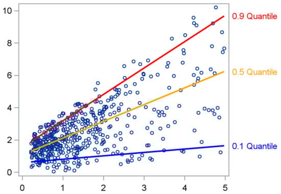 The regression line approximates the values of fairly well when is small, but as increases, the spread of becomes larger. Although each subgroup of values (for a given ) may still be approximately normal, their variances differ substantially. This pattern of increasing variability—common in epidemiological and biomedical data—renders the model estimates inefficient and the inference unreliable [3]. In such situations, the mean is no longer an appropriate measure of central tendency. For example, when modeling biomarkers, hospitalization duration, or healthcare costs, data are often right- skewed, meaning that a small number of high values distort the mean. A regression model focusing exclusively on the conditional mean of can thus misrepresent the true nature of the relationship between predictors and outcomes [4,5,6].