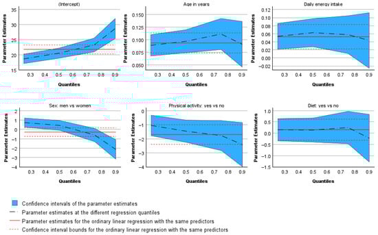 The plots of the estimated parameters [28] that follow illustrate the variation in coefficients across all quantile regressions (Figure 4). In the plots for age, energy intake, physical activity, and dieting, the dashed line representing the estimated coefficients remains within the confidence intervals of the corresponding parameters from the ordinary least squares regression. This indicates that the results for these variables do not differ substantially from those of the linear regression model. Only the line representing the gender coefficients lies outside the confidence interval range, graphically confirming the earlier finding that the effect of gender on BMI is not monotonic in direction. The regression coefficients for the median and the 0.75 quantile fall within the confidence interval boundaries, whereas those for the 0.25 and 0.90 quantiles alternate in sign, lying below and above the confidence region, respectively.