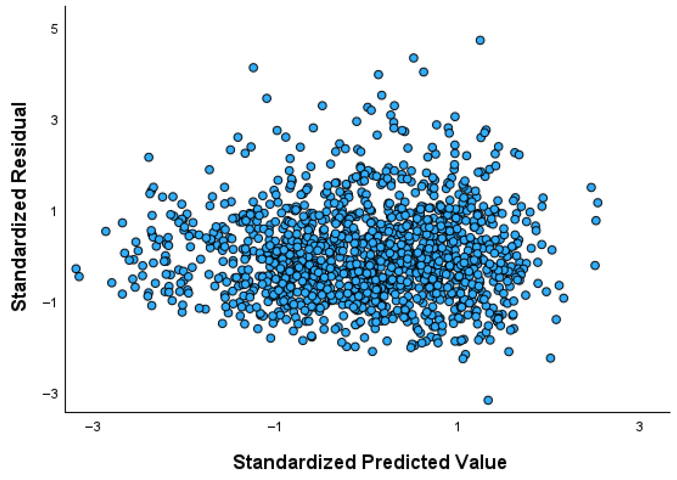 Figure 3 illustrates the residuals-versus-fitted plot, revealing a violation of the homoscedasticity assumption, as indicated by the conical dispersion pattern of the residuals. This widening pattern reflects substantial heteroscedasticity, thereby supporting the use of quantile regression, which is not affected by non-constant variance.