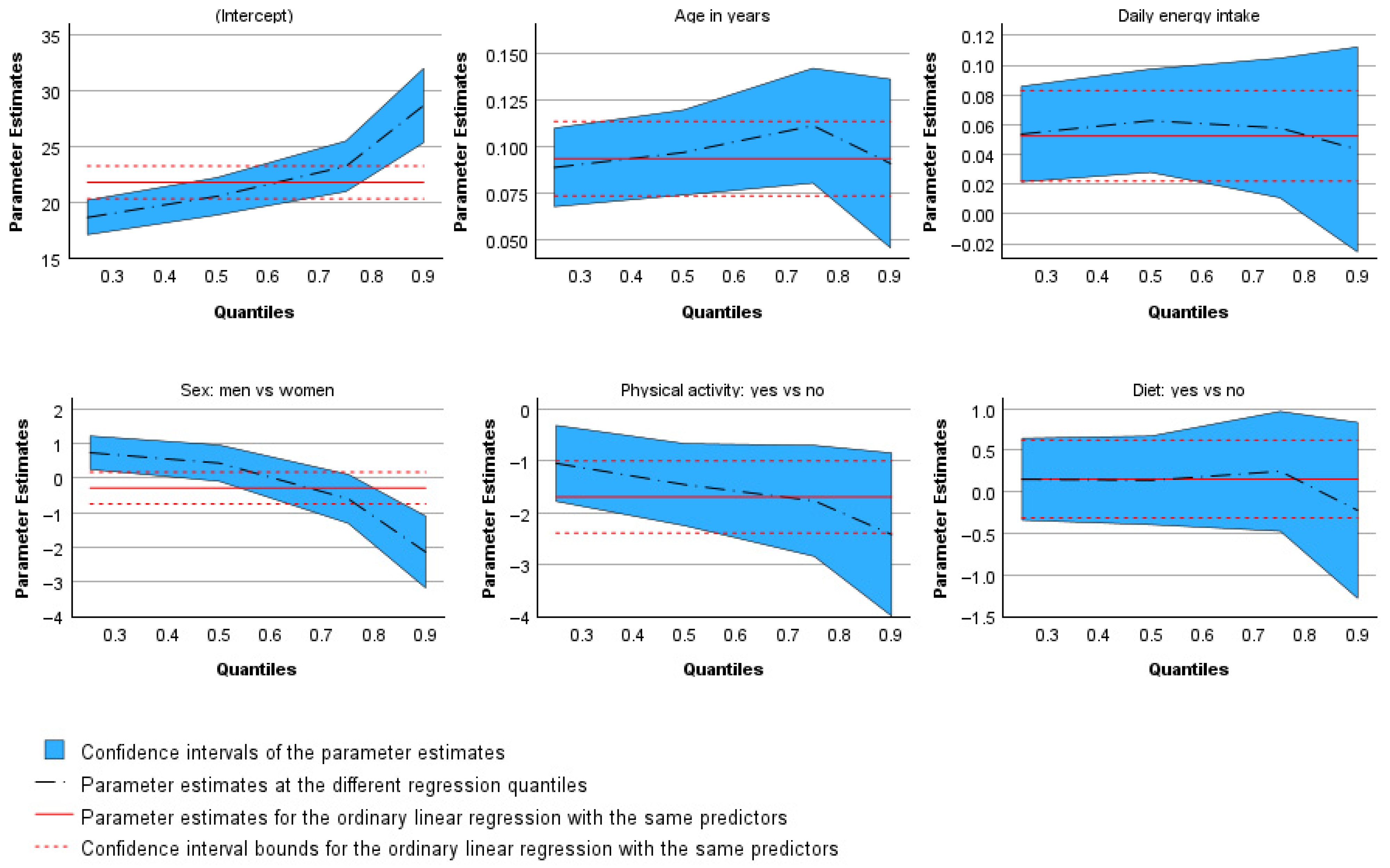Figure 4). In the plots for age, energy intake, physical activity, and dieting, the dashed line representing the estimated coefficients remains within the confidence intervals of the corresponding parameters from the ordinary least squares regression. This indicates that the results for these variables do not differ substantially from those of the linear regression model. Only the line representing the gender coefficients lies outside the confidence interval range, graphically confirming the earlier finding that the effect of gender on BMI is not monotonic in direction. The regression coefficients for the median and the 0.75 quantile fall within the confidence interval boundaries, whereas those for the 0.25 and 0.90 quantiles alternate in sign, lying below and above the confidence region, respectively.