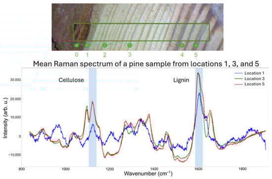 In one study, Raman microscopy was used to quantify the lignin contents of various wood tissues in Japanese wood species. This study revealed that the lignin contents in wood varied depending on species or tissues [20]. The utilization of Raman spectroscopy in wood biomass research was presented by Anni Lähdetie [21] in her doctoral thesis. This detailed study illustrates the research in the analysis of the structure and reactions of lignin.