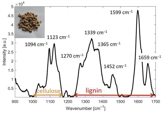 Moreover, it has been shown in several studies that techniques based on infrared spectroscopy (IR) are capable of identification and discrimination of raw materials used in pellet production [22] and also for the identification of five Brazilian native wood species [23]. In the study of Agarwal et al. [24], cellulose crystallinities of a large number of lignocelluloses were estimated using the near-IR Fourier transform (FT)-Raman method. The authors pointed out the role of lignin and cellulose. The prediction of hardwood and softwood contents in blend samples by means of FTIR was targeted in a study by Duca et al. [25]. In the report by Gao et al., Raman spectra were excited using a 1064 nm laser, thus avoiding the impact of water and autofluorescence on near-IR signals for evaluation of lignin from biomass [26].