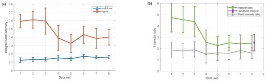 Agarwal et al. [47] plotted the ratio of lignin to cellulose concentration by using the three plots generated for the three bands of cellulose (380, 1098, and 2900 cm−1). All three bands exhibited a similar pattern in regard to the variation in the value of the ratio. Vitek et al. [48] used a ratio of lignin to 1098 cm−1 peak of cellulose. Hence, these previous findings of different groups lead to further support for this methodology being used in our study.