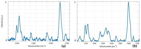 Portable instrument: The use of our portable instrument for recording Raman spectra from wood pellets shows a small increase in the noise level and the resolution of spectra when compared to the lab-based instrument. The differences between the portable and lab-based Raman instruments are not significant for bands of our interest, due to a very high intensity in our dedicated analytes for wood pellets—lignin and cellulose. Figure 5 shows spectra from (a) a portable instrument and (b) a lab-based Raman instrument. This is just to demonstrate that spectra from a handheld instrument are of high quality and may be further utilized for the analysis. To show the data obtained from the handheld instrument, an analysis of spectra obtained by the handheld Raman instrument is presented in Figure 3b. We evaluated sample 8 so that the data from the handheld instrument might be directly (see Figure 3b) compared to the lab-based instrument. The data are shown as a “handheld integral” (see the inset in the top right corner) next to sample 8, which, in turn, demonstrates the feasibility of a handheld instrument in lignin diagnostics.