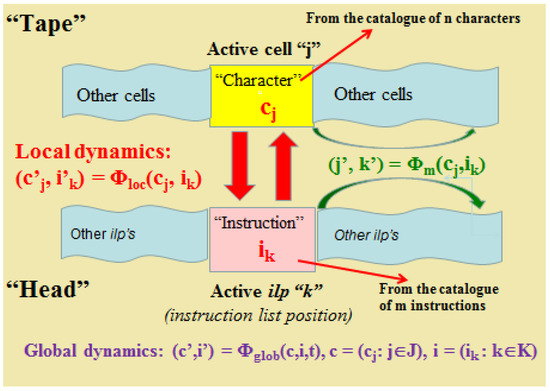 - Computation is understood as an interaction of two compound global information systems (called the “head” and “tape”), each consisting of an infinite but countable sequence of components, which themselves are information systems (the former is called “instruction list positions” (ilp) and the latter is called “cells”). We assume that each component can have an associated address indexed by an integer.