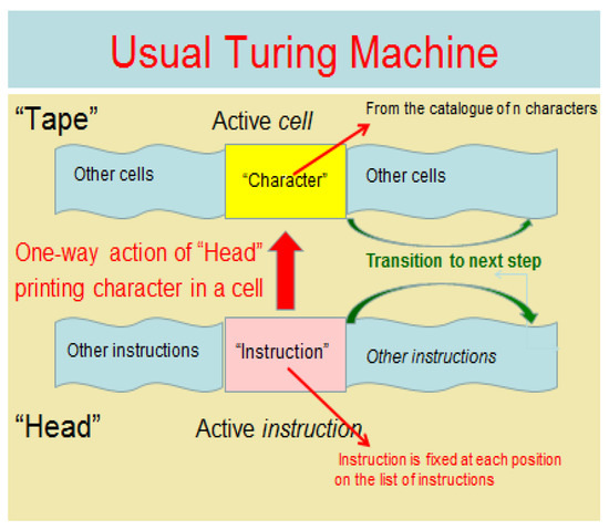 Now, we can proceed to the description of the model of the symmetric Turing machine in the form of a list of main points of its theoretical construction, illustrated below in Figure 1. The description summarizes the content of the publications by the second author preceding his cooperation with Mark [5,6,7,8]. However, the discussions with Mark and his questions were very helpful later in writing this summary by pointing at the parts of the original publications that required additional clarification.