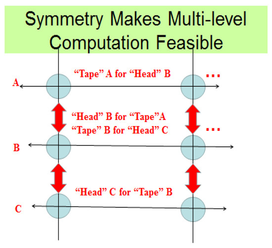 The main reason for the need for revisions was the misstatement of the description of symmetric Turing machines from the earlier publications of the second author [5,6,7,8]. The most important feature of this model is a more general dynamic of information in the process of computation. In Turing machines, this dynamic of information is only in the form of one-way action of the head on tape, which is separate from the one-way action of the combined information of the content of a cell with information in the present instruction controlling the position of the head; in symmetric Turing machines, in the general case, it is a mutual interaction that characterizes all the physical processes, where the term “physical” is understood not just in epistemic way of the methodology of physics but in ontological way as a characteristic of reality or nature. Of course, two one-way actions can be reinterpreted as interactions in some circumstances, but the distinction is non-trivial. Thus, in Turing machines, we have an action as the most fundamental concept which allows for a combination of actions into a secondary concept of interaction. In natural phenomena, in many cases, interactions cannot be reduced to disentangled independent actions.