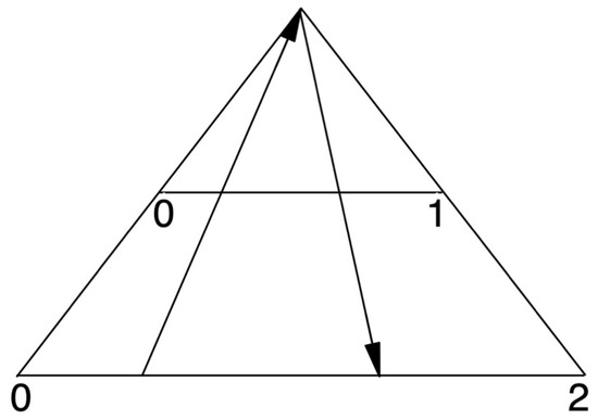 Let us assume that the lines, 0–1 and 0–2, are lengths embedded in a continuous space, so each is analogous to a real number line and contains an uncountable infinity of points. Imagine that we draw a line from the top of the triangle to each point in the longer line. This drawn line will intersect the shorter line at exactly one point. At the same time, any such drawn line can be read in reverse, i.e., as running from each point on the second line to the top, passing through exactly one point on the first line. Hence, there is a one-to-one correspondence between the points on each line, and we may conclude that each line consists of a set of points with the same cardinality, 2N.