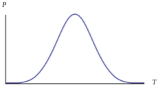 Sometimes probabilities involving infinite domains can be tamed, i.e., normalized, by defining, over the domain, a function that converges on a finite value. For example, if the domain satisfies a normal distribution with a finite mean, then, because the graph of this distribution approaches zero on both sides, the total area under the graph converges to a finite value and can be set to one. The graph in Figure 2 represents a normal distribution of some measure, P, over an infinite set of times.
