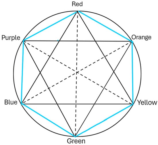 Goethe’s color hexagon/hexagram/circle, represented as a modification of the diagram given in the 1840 English translation, Goethe’s Theory of Colors [] (plate 1, Figure 3).