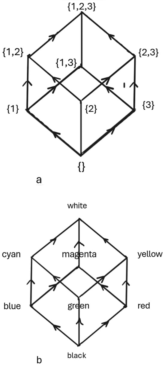 In the color equivalent, it can be appreciated how blue can be considered a component of both cyan and magenta, as, regarding color mixing, blue mixed with green results in cyan, while blue mixed with red results in magenta. However, just as the empty set is included in the sets {1}, {2}, and {3}, in Jaspers’s color Hasse diagram, black is represented as “mixed” with all the three colors immediately above it, blue, green, and red. Clearly, Jasper’s diagram clashes with the intent of Goethe’s hexagon to represent colors in terms of their sensed quality of mixing. For Jaspers, adding black to another color is not like not adding anything at all—that is, it “adds” the absence of color. In short, the role of black in Jasper’s diagram only makes sense when it is considered as the absence of white or, more correctly, brightness (light).