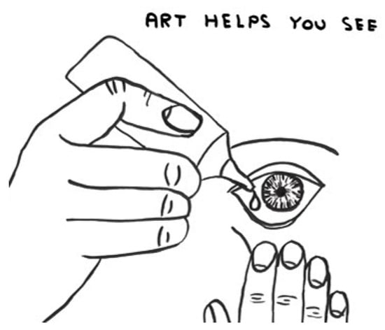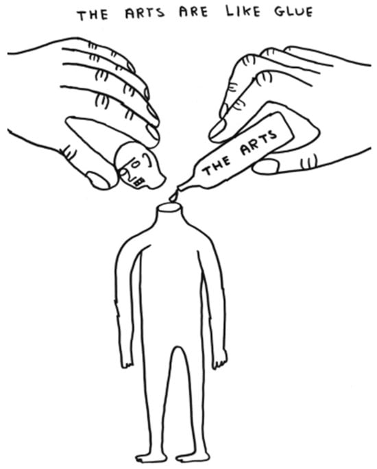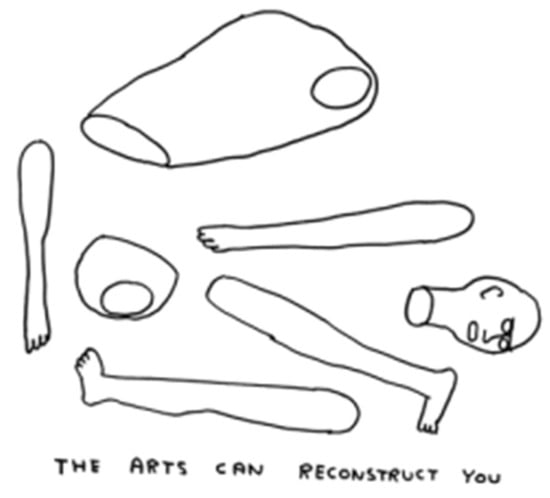 Two line work drawings (Figure 1 and Figure 2) used to illustrate the Creative Health Short Report (2017) [25] serve to confirm the recovery narrative as a technique of subjectification. The sentiment that art can support ‘broken people’ is worthy but what goes unasked is how they fell apart in the first place.