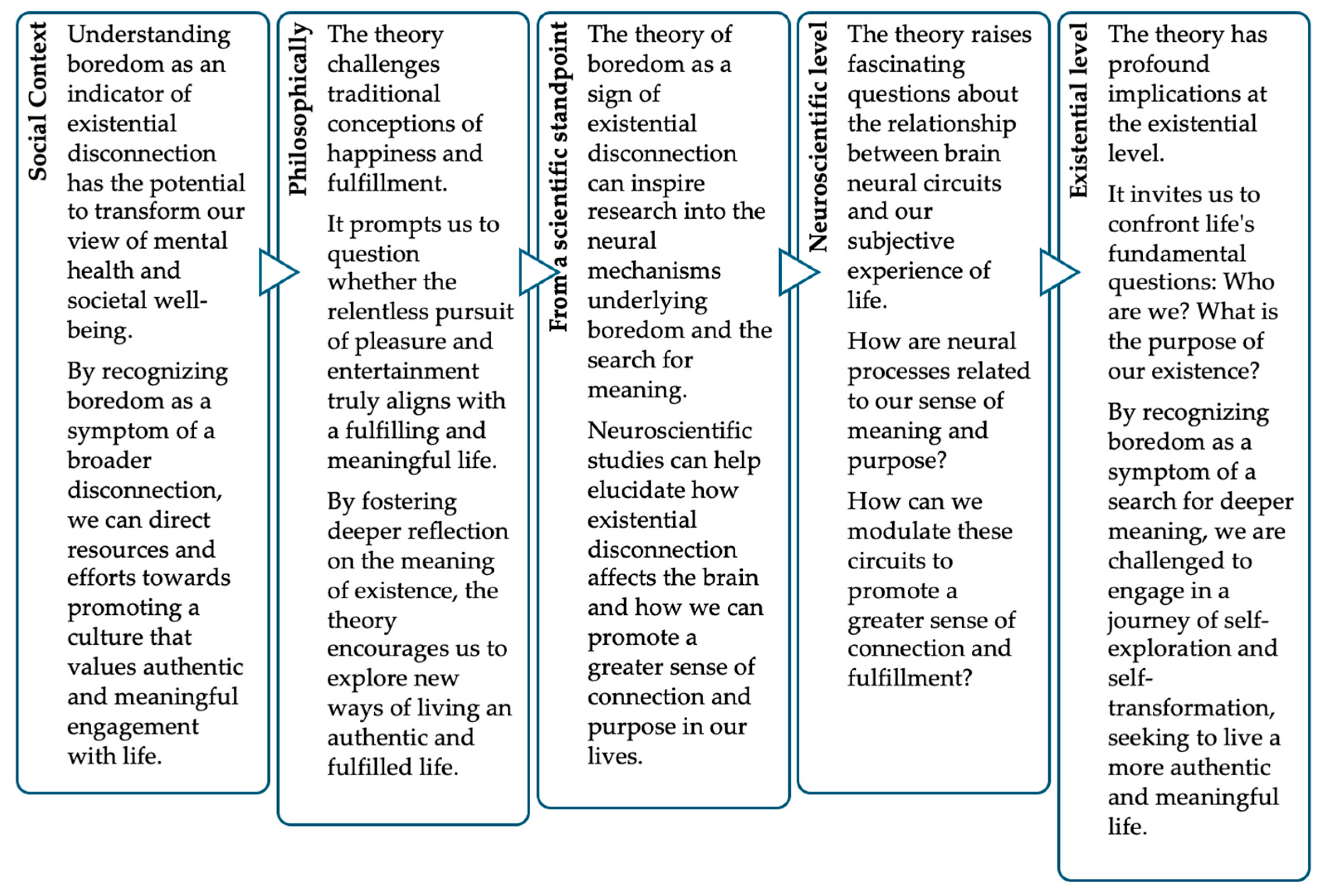 In sum, the theoretical implications of the model position boredom as a liminal phenomenon—situated between disengagement and transformation. It is a moment in which the subject is confronted with the collapse of inherited meanings and invited (though not compelled) to reconstitute a way of belonging to the world. Far from being merely an obstacle to well-being, existential boredom can function as a catalyst for existential reconfiguration, prompting renewed commitments and a rearticulation of one’s practical horizon.
