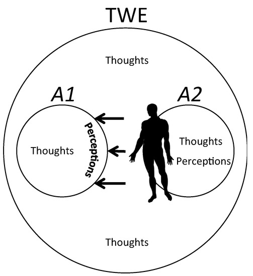 As a matter of fact, these empirically-motivated speculations can be couched in recent theoretical results. Donald Hoffman’s interface theory of perception [29,30], for instance, shows that evolution emphasizes perceptual qualities conducive to fitness, not to truth. In other words, we have evolved to perceive not the qualities that are really ‘out there’—that is, outside our alter—but just a representation thereof that helps us to survive and reproduce. Hoffman uses the analogy of a computer desktop: although a computer file is represented in it as e.g., a blue rectangle, that does not mean that the file itself has the qualities of being blue and rectangular. As a matter of fact, the actual file does not have those qualities at all: it is a pattern of open and closed microscopic switches in a silicon chip. In an analogous way, my hypothesis is that the qualities of our perceptions—colors, shapes, sounds, flavors, textures, etc.—are not the qualities of the experiences of TWE that surround our alter, but their ‘desktop representation’ instead. Our perceptions do not feel like the thoughts of TWE (see Figure 2 again) because a qualitative transition between these two experiential categories has helped our ancestors survive and reproduce.