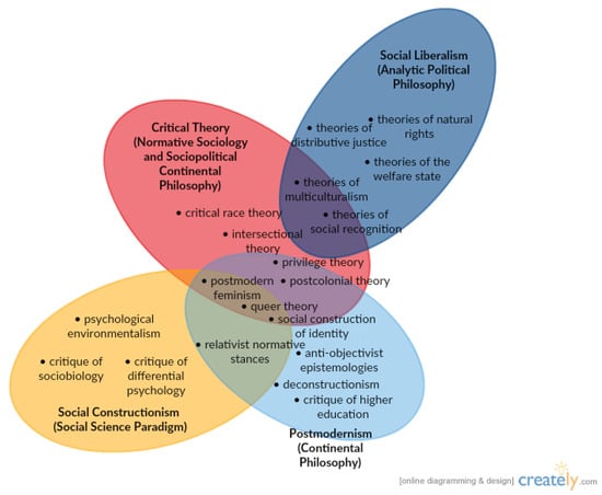Although we could trace the memetic ancestors of this ideology as far away in the past and as much detail as we’d want, I deliberately restrict my attention to four paradigms and some of their various overlaps over the latter half of the 20th century; these are social constructionism, critical theory, social liberalism, and postmodernism.
