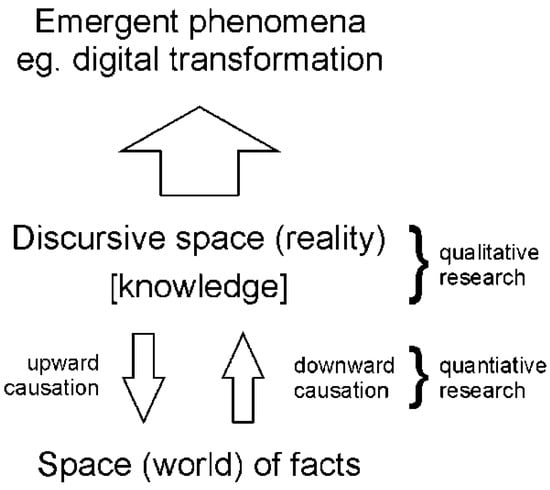 The next conclusion concerns the nature of the discursive space. The world of facts is complex—this assumption is also uncontroversial—so the complex nature of discursive space is necessarily complex too, which results from the relation of supervenience. The complexity of discursive space subsequently allows for emergent phenomena. Such phenomena are, e.g., the internet or digital transformations that exist as linguistic entities. However, they are also expressions of knowledge, which result from the idea of discourse. They can therefore also be called epistemological constructions, if we assume that knowledge is the result of the cognitive process. This last observation seems to transfer the problem to a level strongly associated with the subject in the meaning of man. However, such a relationship is not necessary; Burgin wrote: “cognitive systems, e.g., intelligent agents or cognitive actors, store and employ a variety of epistemic structures in different forms and shapes” [] (p. 177). A similar possibility in the process of dealing with knowledge I assumed independently in [] as an element of the so-called pragmatic management concept.