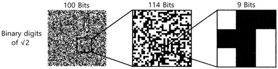 Algorithmic information of data is defined as the bit length of their shortest description [30]. In this sense, natural laws are a shorter description of data patterns. In order to illustrate the relation of simple laws and complex data, we consider a mathematical example in Figure 1 [17] (p. 491): The left pattern is very complex and represents the decimal places of as binary numbers of 0 and 1, which are illustrated by white and black squares. It is assumed (but still not rigorously proved) that the decimal places of behave like random numbers with all kind of patterns. Nevertheless, there is a finite computer program to compute , which only needs circa 100 bits. This computer program corresponds to a short (computable) law, which covers an unlimited huge amount of data. The description of the middle partial pattern in Figure 1 is even more complex than the whole left pattern, because it needs 14 additional bits to locate the beginning bits of the partial pattern in the whole pattern. The right pattern only needs nine bits. There would be no advantage to locate this pattern by additional bits in the whole distribution.