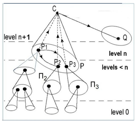 From the Reduction Theorem (Section 2.4) it follows that a hierarchical category H without multifaceted objects is reducible to its level 0. Now let us suppose that H has n-multifaceted objects for each n. An object C of level n+1 has at least one ramification down to level 0, consisting of a lower-level decomposition P of C, then a lower-level decomposition Πi of each object Pi of P, and so on down to level 0 patterns forming the basis of the ramification (cf. Figure 2). In this way, C is reducible to P, each object Pi of P is reducible to Πi, and so on top-down through to level 0. This defines a kind of step-by-step reductionism for the objects, with emergent properties related to the bottom to top formation of the different colimits at each step. This situation corresponds to what M. Bunge [8] has called an ‘emergentist-reductionism’.