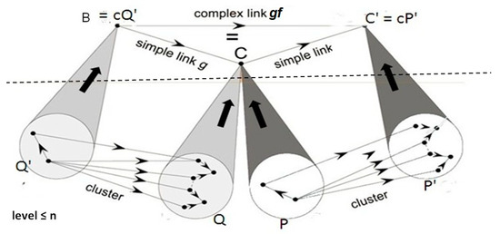 From the universal property of the colimit, it follows that such a cluster binds into a unique morphism f from C to C’, called a (P, P’)-simple morphism or just an n-simple morphism if the objects of P and P’ are of levels ≤ n. If C and C’ are of level > n, such an n-simple morphism represents a morphism of level > n which transmits only information mediated through individual objects of the patterns, hence entirely accessible at level ≤ n; we can say that g is reducible to (the cluster) of level ≤ n. Let us note that any morphism f of level ≤ n is n-simple, as well as a morphism connecting an object of level n+1 to an object of a level ≤ n. An n-simple morphism is also n’-simple for n’ > n, A composite of n-simple morphisms binding adjacent clusters is still an n- simple morphism.