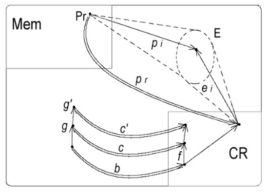 At each step, CR only receives partial information from the system via the active links b, c,… arriving to it during the step. This information is processed in the landscape of CR at t which is an Evolutive System Lt having those links for components; in particular the CR is itself included in the landscape. Using the differential access of CR to the memory Mem, an adapted procedure Pr is selected on this landscape (via pr), and the corresponding commands are sent to effectors E of Pr (Cf. Figure 6).