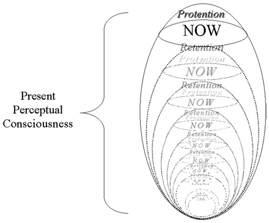 Figure 1 in this paper (Figure 3 in [5]) presents a schematic outline of the present moment of consciousness, as understood (in outline) by Husserl. Both the example just above and the diagram suggest discrete time steps and sharp boundaries between phases of temporal experience, but this is just for clarity. Husserl imagined a continuous slippage or flow of time. In addition, the nesting depicted reaches into retention only, omitting equally complicated structures of protention.